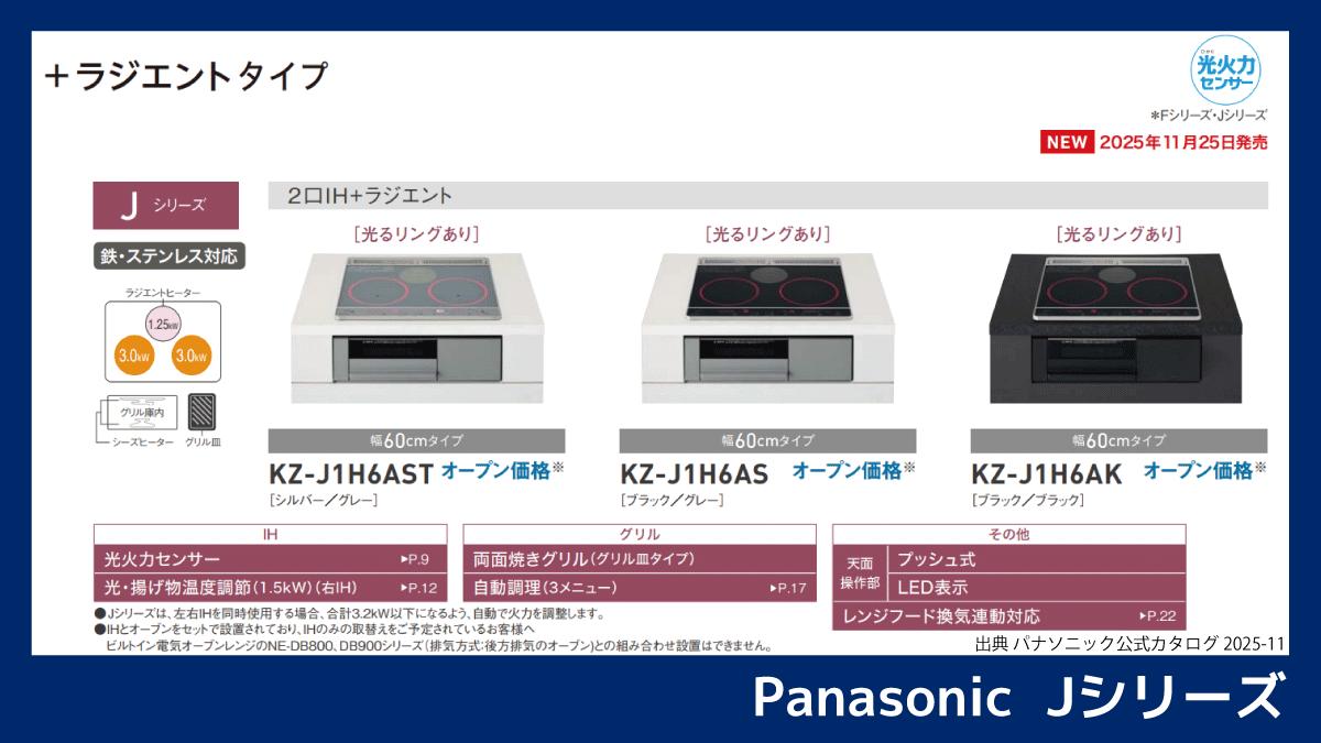 Jシリーズではこれにより、右IHの「光・揚げ物温度調節」で、食材投入で油温が下がっても検知して火力を上げ、設定温度へ戻す(温度復帰が速い)機能があります。