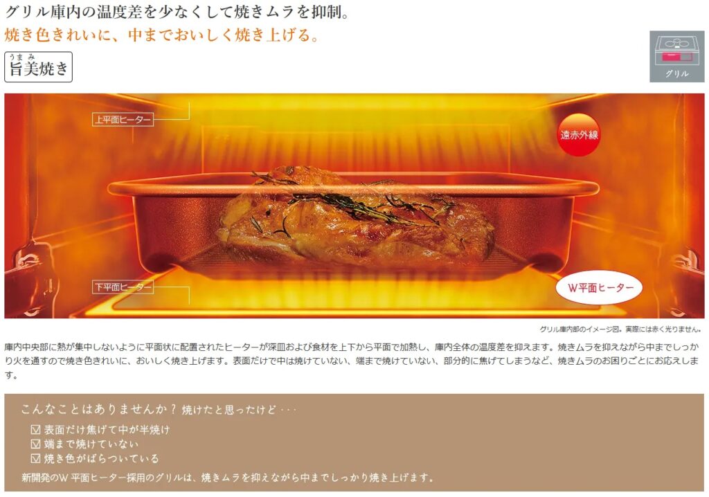 平面状に配置されたヒーターで深皿・食材を上下から“平面で”加熱し、庫内全体の温度差を抑えて焼きムラを抑制するというもの。