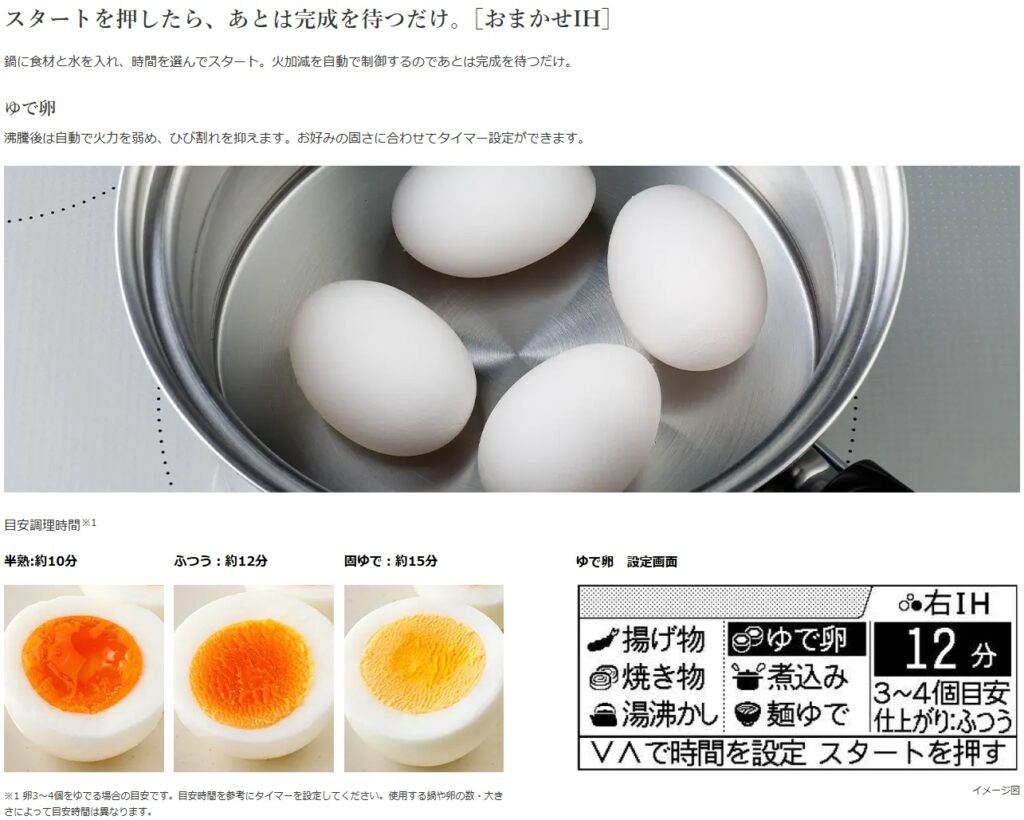 「ゆで卵」は鍋に水と卵を入れてスタートすれば沸騰したら自然に火を弱めて調理継続。タイマー設定で半熟から固ゆでまで好みに合わせた仕上がりに。