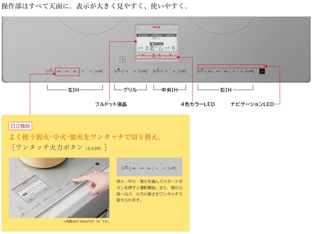 ・HT-N9STF(60cm)、HT-N9STWF(75cm):中央IHが2.0kW8段階(このページのモデルN8ATは1.6kW7段階)、おまかせIH無し/適温調理サポート有り(この部分はN100T寄り)、ブラック無し 60cmで11万円前後(26/01調査)