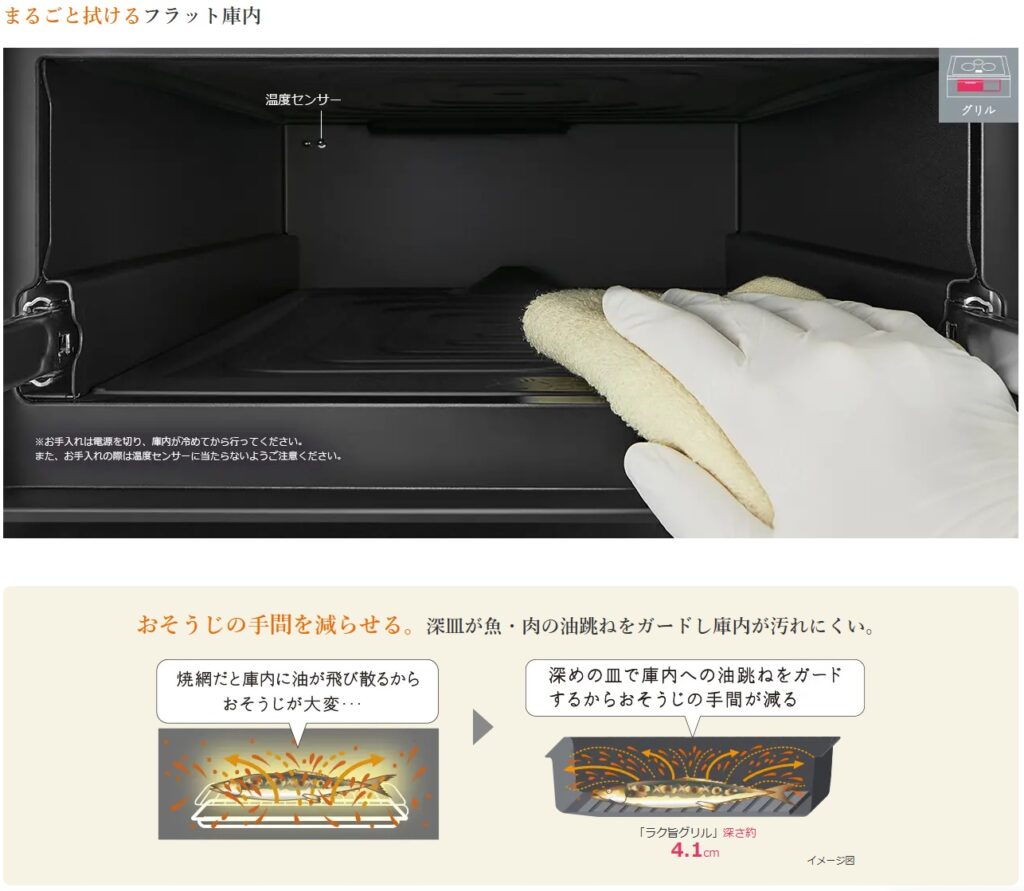また、グリルトレーが深いのも日立の大きな特徴のひとつ。トレーも庫内も掃除しやすくすることで手間やストレスを軽減してくれます。