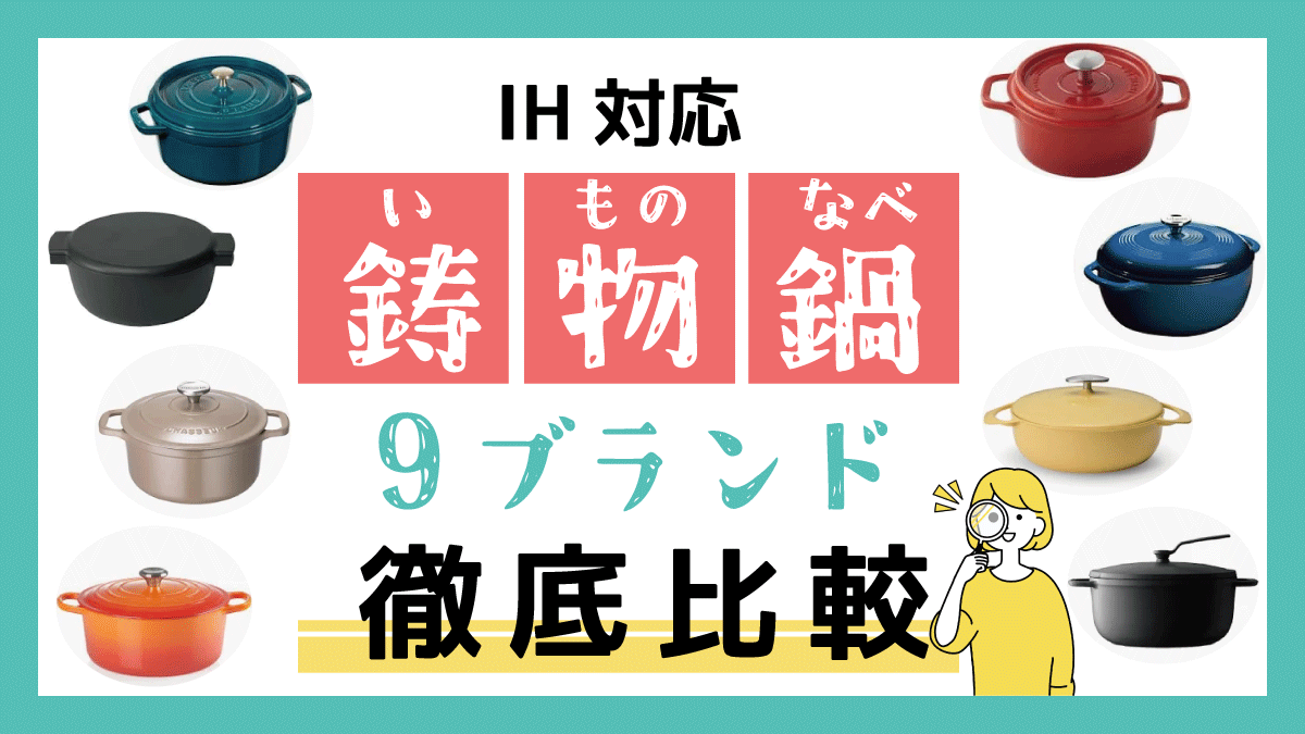 「重さが気になる」「より無水調理にこだわりたい」「コスパを重視したい」など、重視するポイントに合わせて選べるよう、IHにぴったりの鋳物鍋主要ブランドとその特長をまとめました。ページの最後には、鋳物鍋の定番【22cm両手鍋】の全9ブランド価格比較もありますので参考にしてください。