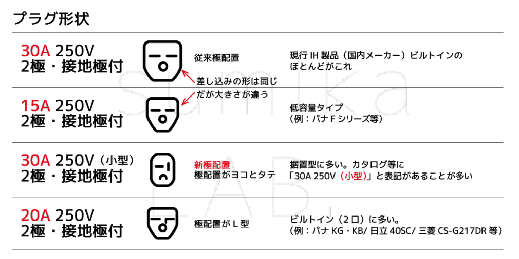 パナソニックの買替え対応案内でも、IHは機器によりプラグ/コンセント形状が異なるとして、30A・15A・20Aなど複数タイプを一覧で示し、「形状が違う場合は電気工事が必要」と明記しています。